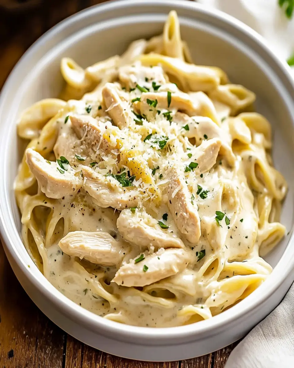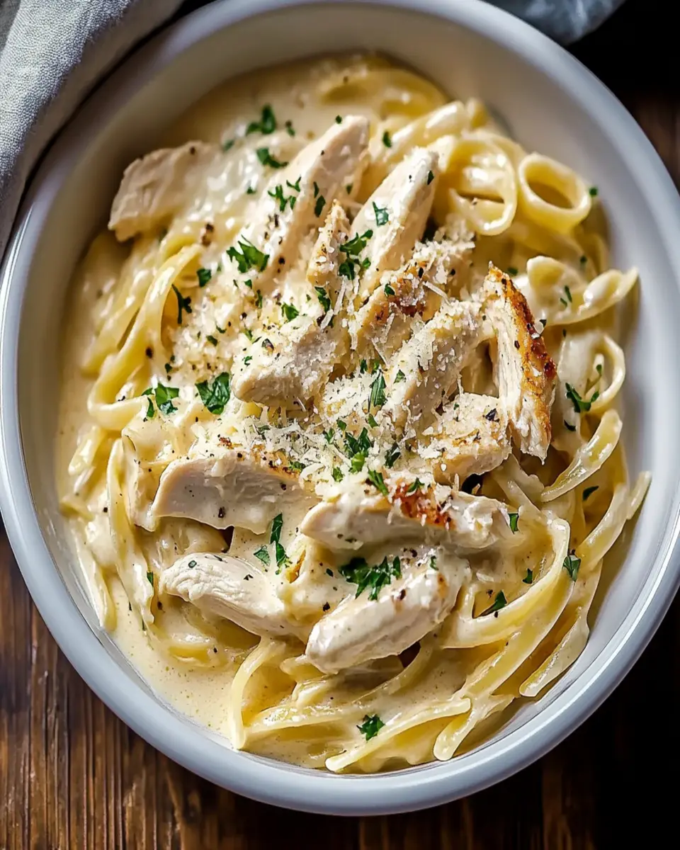 In this recipe, tender chicken breasts are seasoned and paired with a rich, creamy sauce made from heavy cream and Parmesan cheese. The dish is completed with perfectly cooked fettuccine, bringing together the flavors of Italy in one satisfying bowl. Serve it with a sprinkle of fresh parsley for a touch of color and an extra layer of flavor.