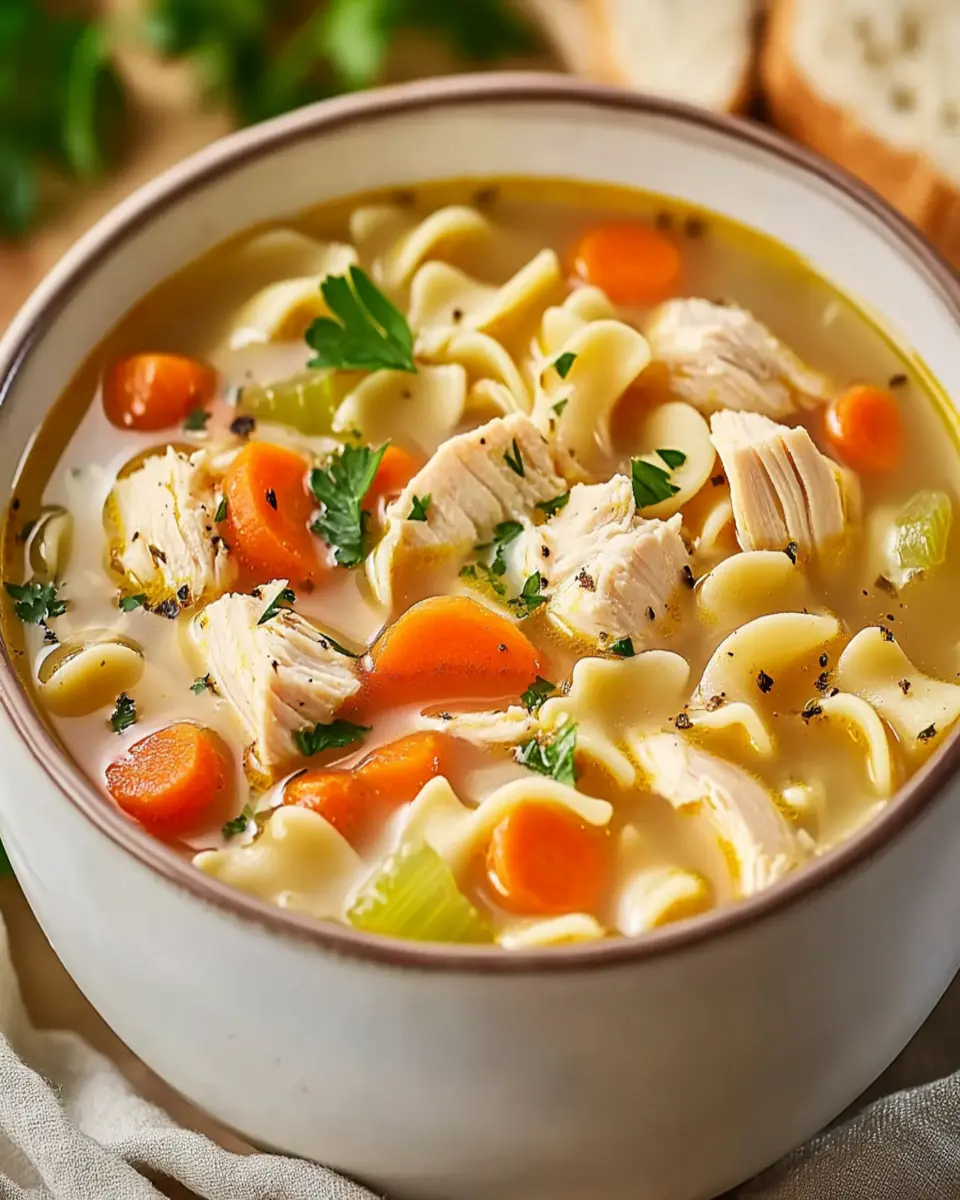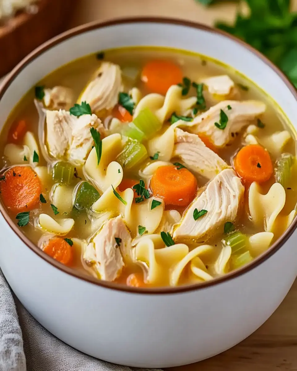 Using tender, shredded chicken ensures that every spoonful is packed with protein, making this soup not only comforting but also satisfying.