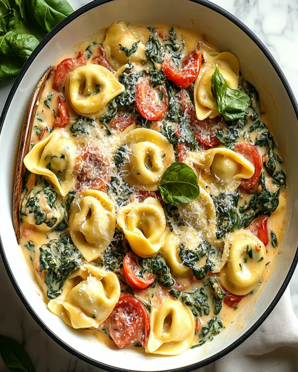 A delicious and creamy pasta dish filled with spinach, tomatoes, and cheesy tortellini, perfect for a quick weeknight meal!