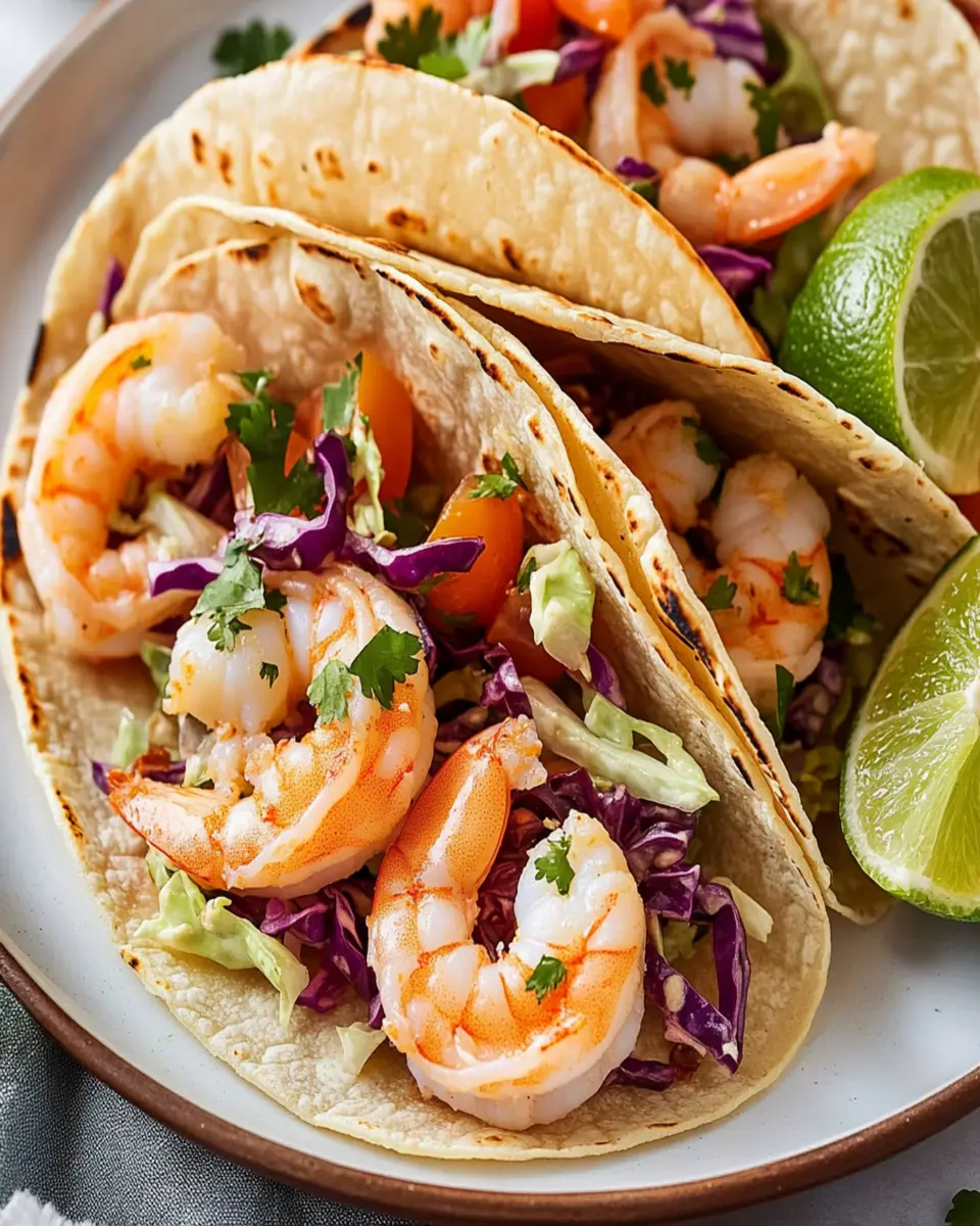 Soft and warm, corn tortillas serve as the perfect vessel for holding the shrimp and slaw, adding a delightful texture to each taco.